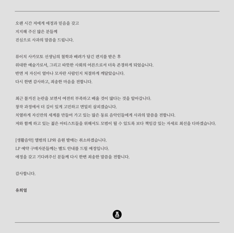 앞서 유희열이 '생활음악' 프로젝트의 두 번째 트랙인 '아주 사적인 밤'이 일본 영화 음악의 거장 사카모토 류이치의 '아쿠아'와 유사하다는 지적이 나왔고, 이와 관련 잡음이 이어지자 거듭 사과한 것으로 보인다.