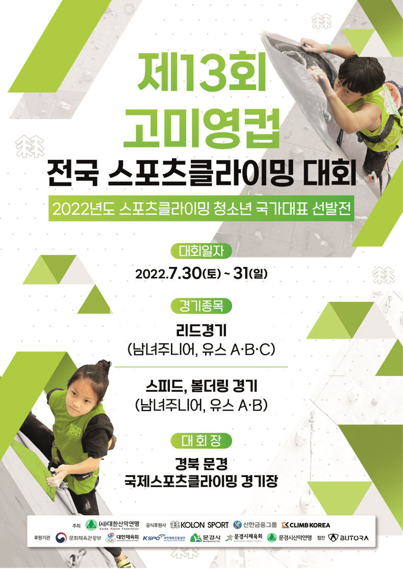 [제주교통복지신문 이청 기자] 사단법인 대한산악연맹은 오는 7월 30일, 31일 경북 문경 국제스포츠클라이밍경기장에서 '제13회 고미영 컵 전국 청소년 스포츠클라이밍대회'를 개최한다.