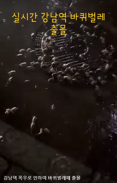 10일 온라인 커뮤니티 등에는 '실시간 강남역 바퀴벌레 출몰 상황'이라는 제목의 글과 영상이 빠르게 퍼지고 있다. 10초 분량의 영상을 보면 적어도 80마리에 가까운 바퀴벌레들이 하수구 인근에서 우글거리고 있다. 하수가 역류하면서 맨홀로 바퀴벌레 떼가 밀려 나온 기현상이다.