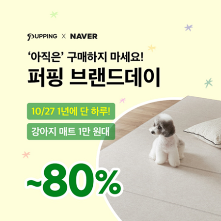 업체 측에 따르면 이번 네이버 브랜드 데이에서는 퍼핑의 대표 제품인 ‘강아지매트’를 포함해 이동가방과 논슬립 펫스텝·펫슬라이드, 강아지방석, 짐볼 등 퍼핑의 전 제품을 최대 80%까지 할인된 가격으로 선보인다.