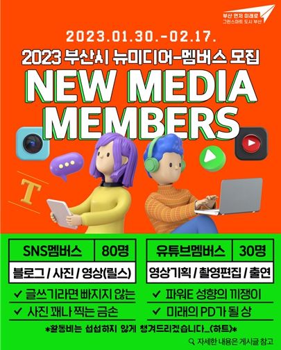 [제주교통복지신문 김강석 기자] 부산시는 시민의 눈높이에 맞는 생생한 부산의 소식을 전달할 ‘2023 부산시 뉴미디어멤버스(시민기자단)’ 110명을 오는 17일까지 모집한다고 밝혔다.