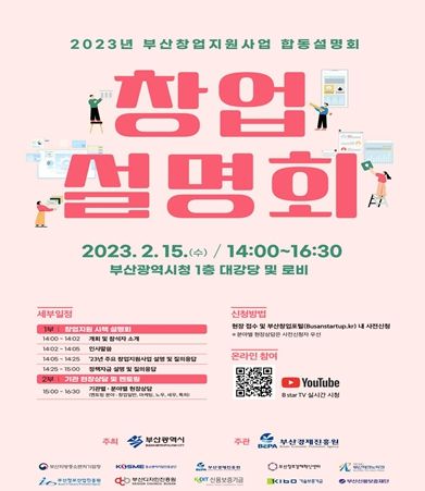 [제주교통복지신문 김강석 기자] 부산시는 오는 15일 오후 2시, 시청 1층 대강당에서 10개 창업지원기관과 함께 최초로 온·오프라인 동시 진행하는 '2023년도 부산 창업지원사업 합동설명회'를 개최한다고 밝혔다.