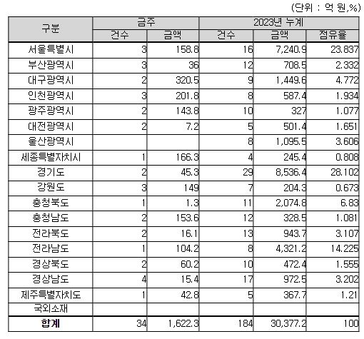 지역별로는 대구광역시 320억 원, 인천광역시 202억 원, 세종특별자치시 166억 원, 그 밖의 지역이 934억 원이다.