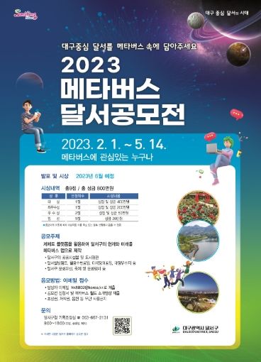 [제주교통복지신문 김강석 기자] 대구 달서구는 5월 14일까지 달서구의 다양한 모습을 널리 알리고 메타버스에 대한 주민 관심도를 제고하기 위한 '2023 메타버스 달서 공모전'을 연다.