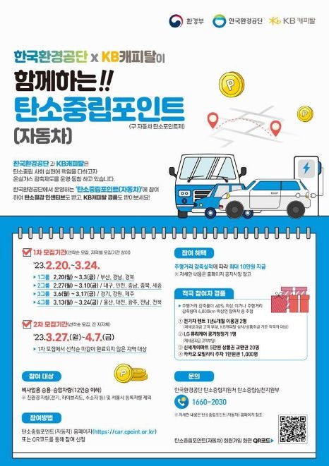 참여방법은 탄소중립포인트제(자동차) 홈페이지에 접속해 가입하여 차량번호판과 누적주행거리(ODO)계기판 사진을 제출하면 된다.