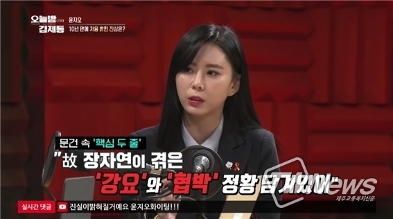 열흘 만에 다시 출연한 윤 씨는 "핵심 두 줄은 100% 고인이 직접 작성한 것으로, 필적 검사를 받아 경찰·검찰에 문건으로 남아있지만 아직 어떤 언론에도 공개되지 않았다"며 "이 두 줄 속에 협박이라는 단어가 두 줄에 명시되어 있다"고 밝혔다.