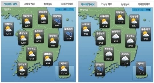 민간기상기업 케이웨더는 "27일(토) 우리나라는 중국 산둥반도 부근에서 동진하는 고기압의 영향을 받아 전국이 대체로 맑겠다"며 "28일(일)에는 동해상에 위치한 고기압의 가장자리에 들다가 남서쪽에서 다가오는 기압골의 영향을 차차 받겠다. 전국이 대체로 흐린 가운데 충청이남지방은 비가 오겠다"고 예보했다.