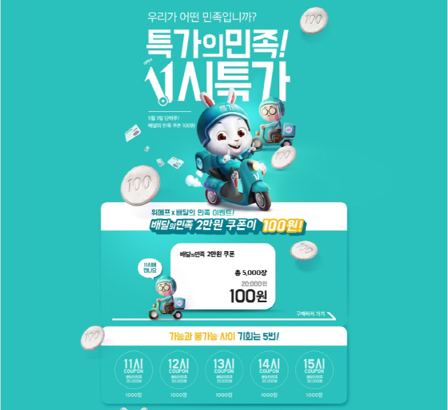위메프 배달의민족 이벤트는 오후 3시까지라는 점에서 더욱 더 네티즌들의 클릭 빈도는 높아질 전망이다.
