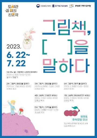 [제주교통복지신문 김지홍 기자] 서귀포시는 문화관광부가 주최하고 한국도서관협회가 주관하며 기적의도서관이 시행하는 도서관 ‘길 위의 인문학’사업 '그림책, ( )을 말하다'을 6월 3일부터 10회에 걸쳐 운영한다.