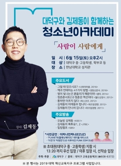 이와 관련 대덕구는 4일 "오는 15일 예정된 대덕구 청소년 아카데미 행사(강연회)에 김제동 씨를 강사료 1550만 원에 초청했다"고 밝혔다.
