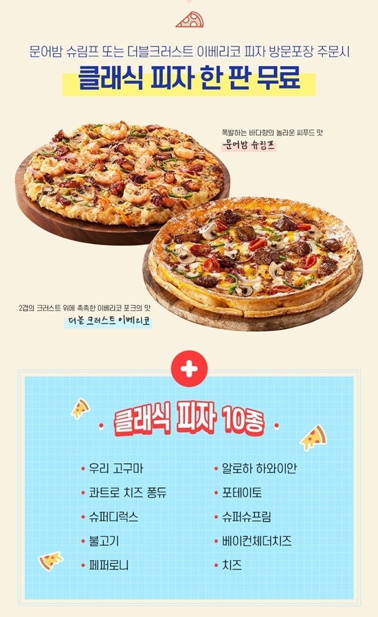 도미노피자 1+1 이벤트는 신제품 문어밤 슈림프 또는 더블크러스트 이베리코 방문포장 주문 시 클래식 한 판을 무료로 제공하는 행사다. 신제품 피자를 맛볼 수 있으면서 총 10종의 클래식 피자 중 한 판을 더 고를 수 있어 합리적인 가격에 푸짐한 피자를 즐길 수 있다.