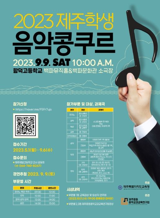 접수기간은 2023년 5월 1일부터 9월 6일까지로 부문별 1등은 교육감상 수여 및 입상자 연주회에 출연하고, 2, 3등은 부문별 제주중등음악교과교육연구회장상을 받게 된다.