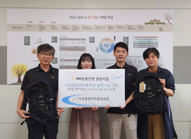 [제주교통복지신문 박희찬 기자] 제주도교육청 NH농협은행 광장지점에서 18일 서귀중앙여자중학교를 방문하여 학생 책가방 20세트(3,380,000원 상당)를 전달했다.