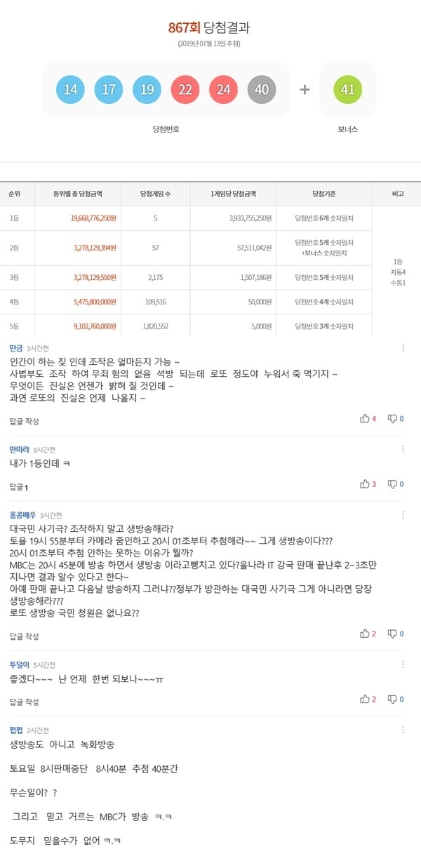 한편 일부 커뮤니티 등에선 로또867회당첨번호 후기가 속속 올라오는 등 일요일 내내 로또 이슈가 특정 포털을 지배할 전망이다.