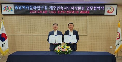 [제주교통복지신문 민진수 기자] 제주특별자치도 민속자연사박물관은 충청남도역사문화연구원과 제주-충남 간 역사자료 발굴 및 학술 공동연구, 소장 유물 상호 교류(조사·연구·전시·활용)를 위한 업무협약을 지난 8일, 충남 공주 소재 연구원 대회의실에서 체결했다고 밝혔다.