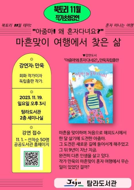 강연은 제주특별자치도 공공도서관 홈페이지를 통해 11월 1일부터 제주도민 50명을 선착순으로 모집한다.