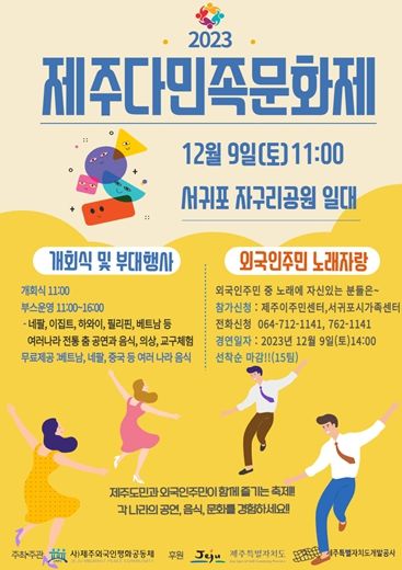 [제주교통복지신문 김지홍 기자] ㈔제주외국인평화공동체가 주최·주관하고 제주특별자치도가 후원하는 2023년 제주다민족문화제 축제가 9일 오전 11시 서귀포 자구리공원에서 열린다.
