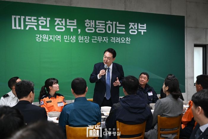 [제주교통복지신문 김강석 기자] 윤석열 대통령은 1월 19일 오후 강원특별자치도 강릉시를 찾아 경찰·소방·사회복지 공무원 및 환경관리원 등 현장 근무자 40여 명과 오찬을 함께했다.
