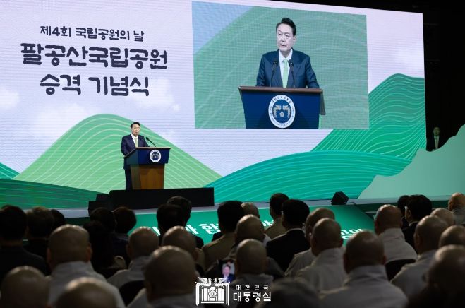 대통령은 기념사를 통해 팔공산 국립공원 승격 논의가 10여 년간 진척이 없었으나 2022년 8월 대구를 찾아 팔공산 국립공원 승격을 약속한 이래 1년도 채 되지 않아 약속을 지킬 수 있었다면서, 이는 정부와 대구시, 경북도가 힘을 모으고 이에 더해 지역주민들의 마음과 불교계의 전폭적인 지지가 보태진 덕분이라며 감사를 표했다.