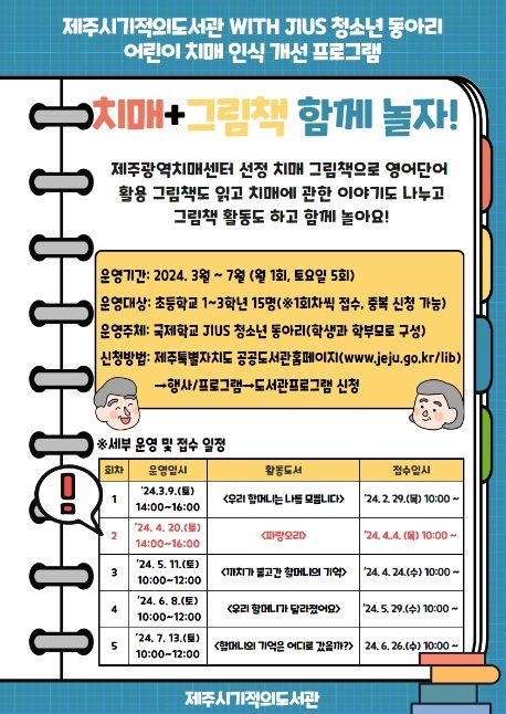 [제주교통복지신문 김지홍 기자] 제주시기적의도서관은 3월부터 청소년 동아리 JIUS와 어린이 치매 인식 개선을 위한 '치매+그림책 함께 놀자!'프로그램을 운영하고 있다.