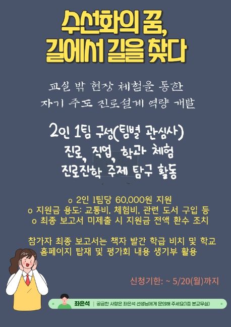이번 프로그램은 5월부터 12월까지 운영되며, 2인이 한 팀을 구성하여 진로·직업체험, 학과 체험, 진로진학 주제 탐구 활동 등을 수행한다. 참가하는 학생들을 위한 주요 내용은 △주말, 방학 중 시간을 활용하여 학생이 교외 활동 설계 △지도교사 매칭 △활동에 소요되는 예산은 학교에서 지원(지원비는 팀당 60,000원) △지원비는 교통비, 체험비, 관련 도서 구입 등에 사용 등이다.