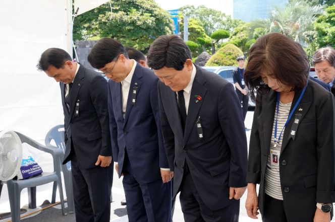 [제주교통복지신문 박희찬 기자] 제주특별자치도교육청은 고(故) 서이초 순직 교사 1주기를 맞아 도교육청 별관 앞에 마련한 추모 공간을 찾아 헌화하며, 애도의 뜻을 전했다. 또한 교육지원청 교육장 및 도교육청 실·국과장들도 함께하여 추모의 시간을 가졌다.