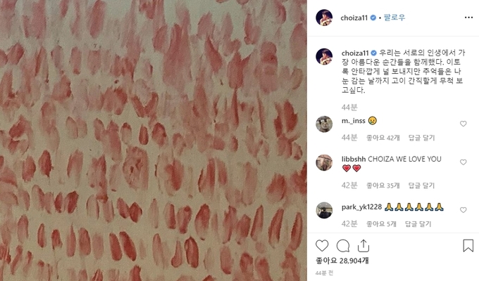 최자는 고인과 인생에서 가장 아름다운 순간들을 함께했다면서 안타까운 마음을 드러냈다. 그리고는 둘 사이 추억들을 간직하겠다고도 했다.