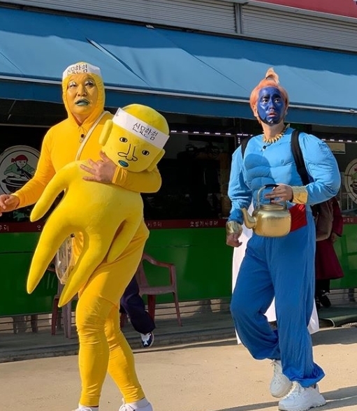 옆에 있던 송민호도 빵 터진 모습이다. 이어 "눈부셔... 원색"이라는 글과 함께 올라온 사진에선 지니로 변신한 규현과 강호동이 길거리를 걷는 모습으로 웃음을 자아냈다.