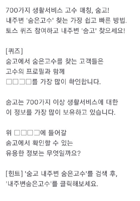 또한 토스는 '고객들이 고수의 프로필과 함께 ○○○○를 가장 많이 확인한다'는 질문을 냈다. 정답은 '고객리뷰'다. '숨고에서 가장 쉽고 빠르게 내게 딱 맞는 고수를 찾는 방법'에 대한 질문은 '1분 요청서'가 답이었다 .