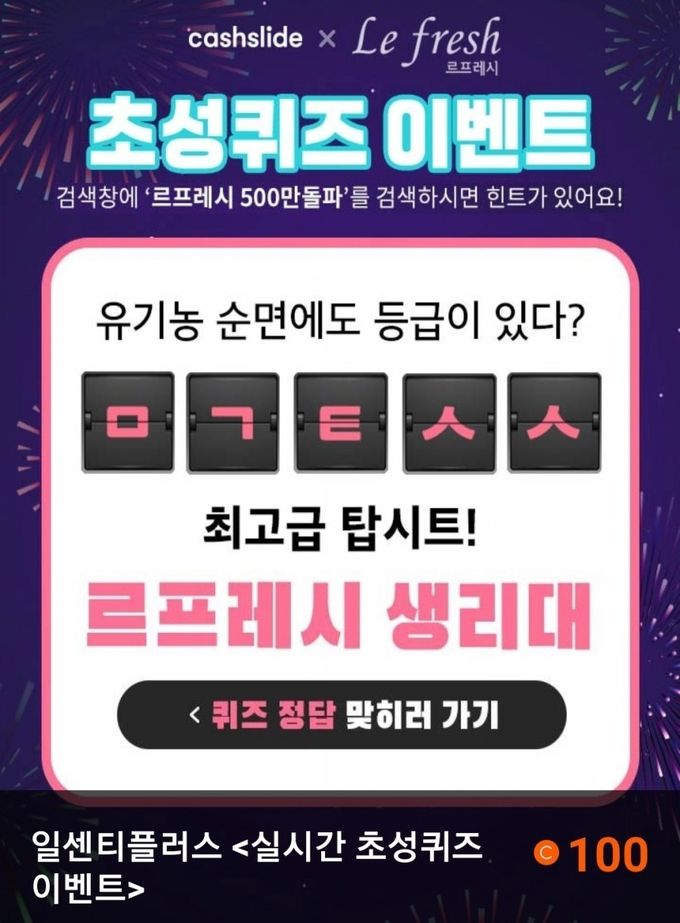 관련해 토스 행운 퀴즈는 르프레시 생리대의 유기농 순면의 원산지, 미국 텍사스를 맞추는 질문과 함께 르프레시의 '안녕, 제주' 응원 프로젝트, 그리고 단독몰 일센티플러스를 묻는 질문을 내놓았다.