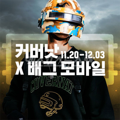커버낫과 배그는 커버낫 배그 모바일 콜라보를 기념해 단 7일 간 3LV 헬멧 아치 로고 크루넥, 후드집업, 밀리터리 맨 C로고 후디, 스페셜 럭색, 3LV 헬멧 커브 캡, 그립톡 등 6종을 10% 할인해 판매한다.