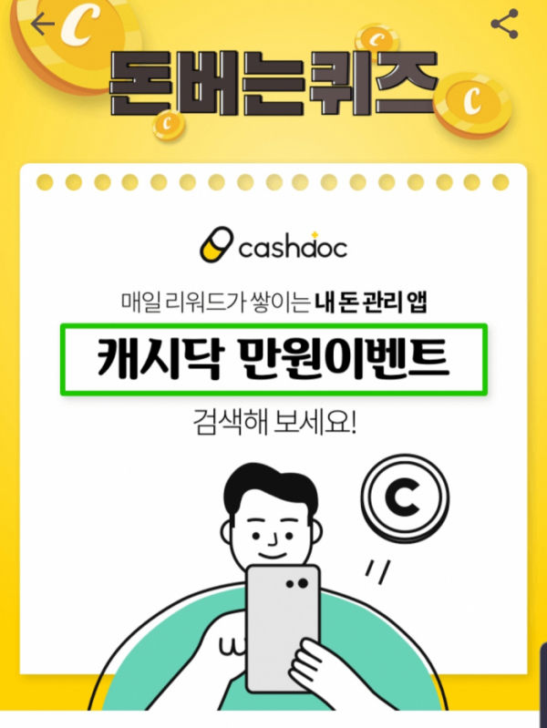 [제주교통복지신문=전희연 기자] '캐시닥 만원이벤트' 키워드가 포털사이트 급상승 검색어에 올랐다. '캐시닥 만원이벤트'와 관련 한 애플리케이션 퀴즈로 등장했기 때문이다.