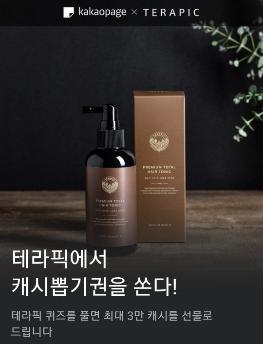한편, 테라픽 헤어토닉 9900원 행사와 관련, KAKAO페이지에선 최대 3만 캐시를 걸고 퀴즈를 냈다. 해당 제품의 주성분 가운데 두피열을 내려주는 성분을 묻는 질문이 나왔고, 답은 '엘멘톨'이다.