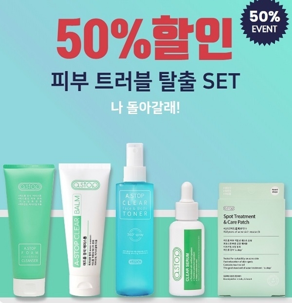 [제주교통복지신문=전희연 기자] 여드름 전문 브랜드 a.stop(에이스톱) 완판세트가 뜨거운 관심이다. 현재 '에이스톱 완판세트'는 최대 반값 행사 중이다.공식 쇼핑몰을 통해 '에이스톱 완판세트'는 피부 트러블 탈출 50% 할인 세트(폼클렌저, 클리어밤, 클리어토너, 클리어세럼, 스팟패치 114EA)와 42% 할인 세트(클리어세럼, 클리어토너, 스팟패치 114EA, 스팟패치 38EA), 35% 할인 세트(클리어토너, 스팟패치 114EA), 15% 할인세트(클리어세럼)으로 준비됐다.