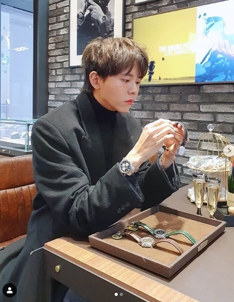 해당 사진 속엔 주우재가 올블랙 시크한 패션으로 행사장 한 켜넹 앉아 여러 종류의 시계를 들여다 보고 있다.
