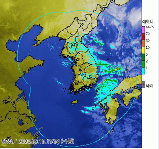 [제주교통복지신문=전희연 기자]일요일인 3월 15일 오후 8시 10분 현재 전국이 구름많고, 강원도, 경북내륙에 산발적으로 빗방울이 떨어지거나 눈이 날리는 곳이 있다.