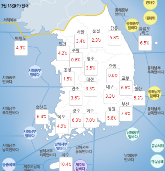 [제주교통복지신문=전희연 기자]수요일인 3월 18일 오전 8시 20분 현재 전국 대부분 지역이 맑은 가운데 중부(강원영동 제외)지방과 전라도에는 짙은 안개가 낀 곳이 있다.