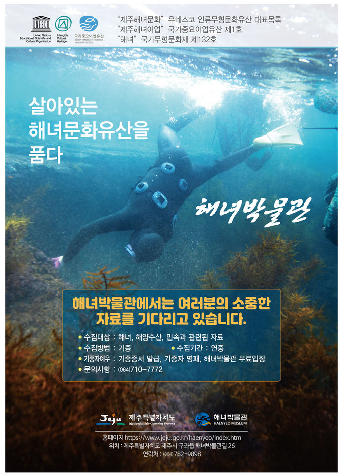 이번 추가 수집 기간을 통해 해녀문화유산의 기반이 되는 다양한 자료를 수집하여, 유네스코 인류무형문화유산 대표목록에 등재된 제주해녀문화가 미래세대에 보다 체계적이고 효과적으로 전승・보전되기를 기대한다.?며, ?전 국민, 특히 제주도민의 적극적인 협조를 부탁드린다”고 말했다.