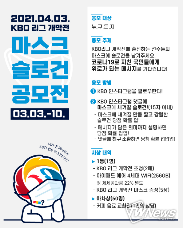 10일 까지 진행될 ‘KBO 리그 개막전 마스크 슬로건’ 공모전은 선수단과 리그 관계자, 그리고 야구팬들과 국민들이 코로나로부터 안전하게 올 한해를 보내자는 의지를 다지고, 리그의 성공적인 완주를 기원하는 의미로 기획됐다. 팬들의 아이디어를 통해 채택된 슬로건은 KBO 리그 개막전에 출전하는 전 선수단 및 관계자가 착용할 공통 마스크에 새겨지게 될 예정이다.