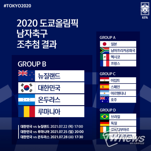 [제주교통복지신문 이주원 기자] 세계 최초로 9회 연속 올림픽 본선 무대를 밟는 한국 남자축구가 도쿄올림픽에서 뉴질랜드, 온두라스, 루마니아를 만난다. 김학범호 입장에서는 무난한 대진이다.