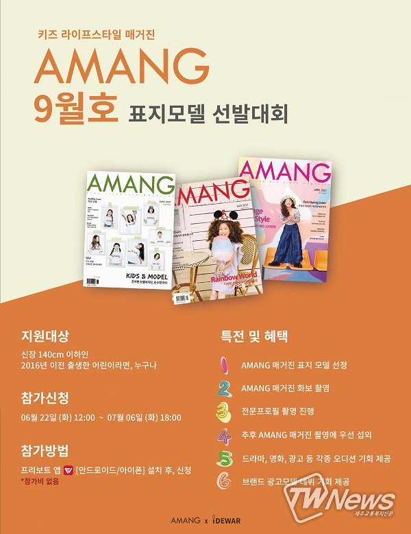 [제주교통복지신문 김지홍 기자] 키즈 라이프스타일 전문 매거진 <AMANG(아망)>이 메인 표지모델 및 메인 화보를 언택트로 O2O 투표 플랫폼 ‘프리보트’를 통해 선발하고 있다고 1일 밝혔다. 현재 프리보트에서는 9월호 표지모델 선발대회 참가 모집이 진행중에 있고, AMANG(아망)은 지난 7월호부터 메인 표지모델 및 메인 화보모델을 프리보트(Freevote)앱을 통해서 독점으로 선발하기로 했다.