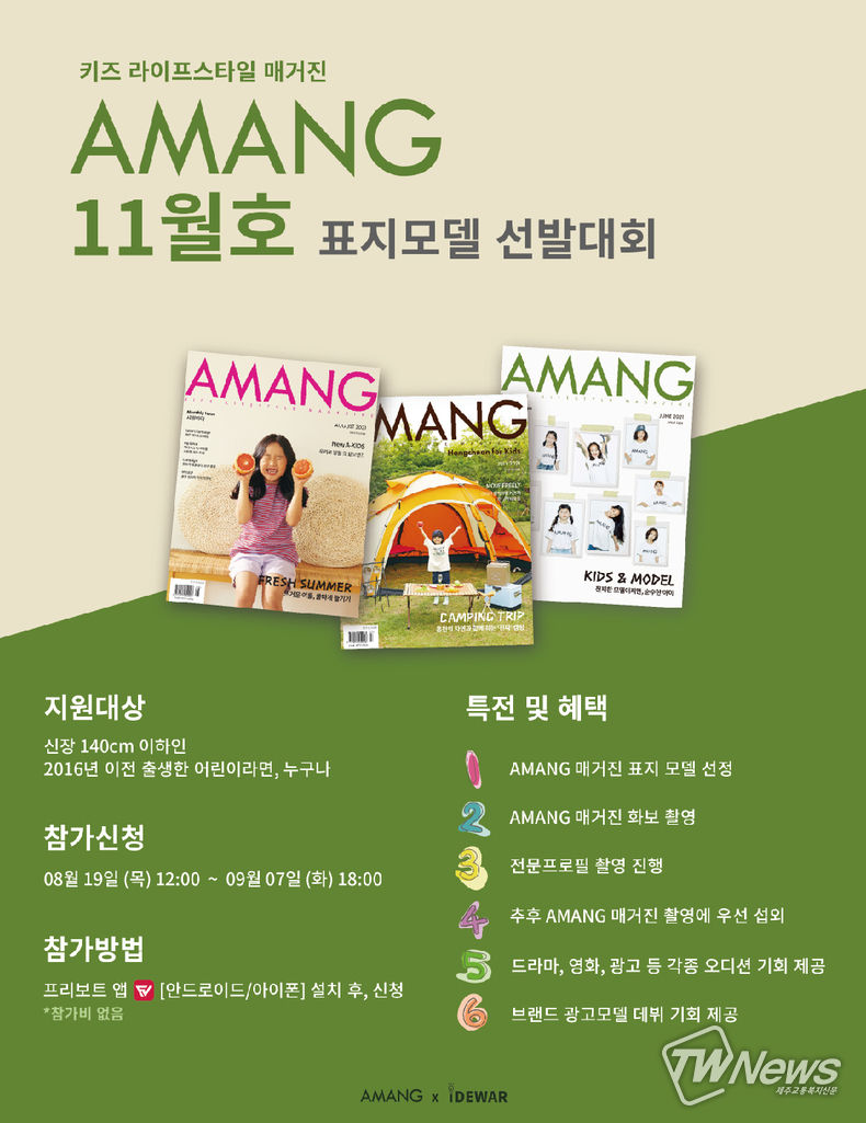 11월 호 참가 신청은 지난 19일 12시부터 내달 7일 18시까지로 신장 140cm 이하인 2016년 이전 출생한 어린이라면 누구나 참여가 가능하며, 별도의 참가비는 발생하지 않는다. 이번 선발 대회에 참가하는 모델 대상자들은 심사 과제에 맞는 사진 및 영상을 준비하여 '프리보트' 앱 내에서 오는 9월 24일부터 28일까지 온라인 심사를 거쳐 표지 모델로서 발탁이 될 기회를 얻는다. 최종 합격자는 10명 이내로 오는 9월 30일 발표된다. 이들은 추후 AMANG(아망) 매거진 촬영에 우선 섭외가 되며 드라마, 영화, 광고 등 각종 오디션 기회를 받는 특전 및 혜택을 갖게 된다.