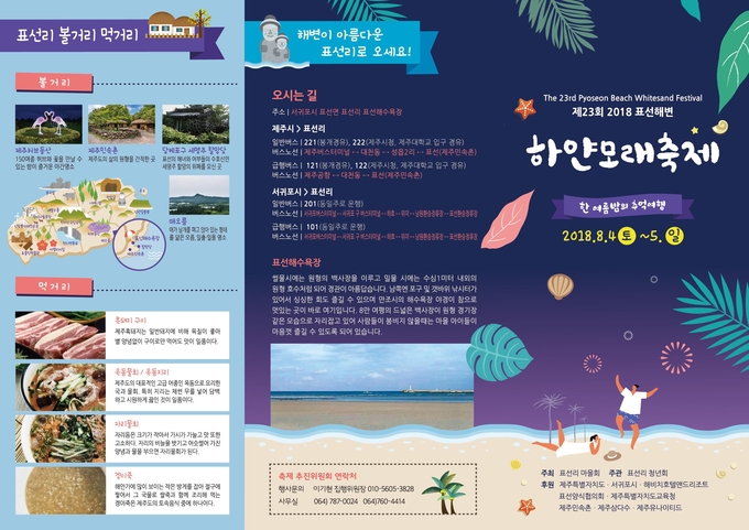 표선리마을회가 주최하고 표선리청년회가 주관하는「제23회 2018 표선해변 하얀모래 축제」가 오는 8월 4일과 5일 양일 간 표선해수욕장에서 개최된다.