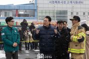 [제주교통복지신문 김강석 기자] 윤석열 대통령은 1월 23일 오후 충남 서천군 특화시장 화재 현장을 방문해 설 대목을 앞두고 피해를 입은 시장 상인들을 위로하고 화재 진압을 위해 고생한 소방관들을 격려했다. 강추위 속에 눈까지 내리고 있는 화재 현장에 도착한 대통령은 미리 대기하고 있던 한동훈 국민의힘 비상대책위원장을 비롯해 김태흠 충청남도지사, 국민의힘 장동혁 의원, 정희용 의원, 정진석 의원, 홍문표 의원, 김형동 의원, 이상민 행정안전부 장관, 오영주 중소벤처기업부 장관 등과 함께 피해 상황을 보고 받고 현장을 둘러봤다. 대통령은 권혁민 충남 소방본부장으로부터 상황을 보고 받고, 올해 가장 추운 날씨 속에서도 인명피해 없이 화재를 진압해 준 우리 소방관들의 노고에 감사를 표했다. "바람이 많이 불어 피해가 커진 것 같다"며 안타까움을 표한 대통령은 피해 점포 수 등 피해현황을 꼼꼼히 질문하며 현장을 살피고 상인들을 면담했다. 현장에 나온 150여 명의 피해 상인들은 대통령의 방문에 감사를 표하고 눈물로 어려움을 호소했다. 대통령은 인근 상가 1층 로비에서 상인 대표들을 만나