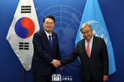 [제주교통복지신문 김강석 기자] 제78차 유엔총회 고위급 회기 참석을 위해 미국 뉴욕을 방문 중인 윤석열 대통령은 9월 19일 오후 유엔 사무국에서 '안토니우 구테레쉬' 유엔 사무총장과 면담을 갖고, 한-유엔 협력과 한반도 문제 및 우크라이나 전쟁에 대해 의견을 교환했다. 윤 대통령은 오늘날 복합위기의 시대에 유엔을 중심으로 한 글로벌 연대의 중요성을 강조하고, 우리의 국제적 위상에 걸맞은 책임있는 역할을 수행하겠다는 의지를 표명했다. 특히, 우리나라가 2024-25년 임기 안보리 비상임이사국으로서 국제사회의 평화증진을 위해 적극적으로 기여하겠다는 의지를 표명했다. 아울러, 윤 대통령은 글로벌 최대 현안인 우크라이나 평화 정착을 위한 우리의 기여 계획도 밝혔다. 한편, 윤 대통령은 북한의 도발을 방지하고 북한의 인권상황이 실질적으로 개선될 수 있도록 유엔과 지속 협력해 나가기를 기대한다고 했다. 구테레쉬 사무총장은 그간 유엔에서의 우리 정부의 활동과 기여에 사의를 표하고, 한국의 안보리 비상임이사국 수임 기간 중 주요 국제 현안 해결을 위해 더욱 긴밀히 소통해 나가기를 기대한다고 했다. 또한, 구테레쉬 사무