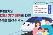 [제주교통복지신문 박상현 기자] 국민권익위원회는 국토교통부와 협업하여 8월 1일부터 14일까지 국민권익위가 운영하는 정책 소통 창구인 국민생각함에서 ‘다자녀 가구 철도이용 할인’에 대한 국민 의견을 수렴한다. 국민 누구나 설문에 참여할 수 있으며, 조사 결과는 다자녀 가구의 경제부담을 완화하고 철도 이용 편의를 높이기 위한 생활밀착형 정책 수립에 참고자료로 활용될 예정이다. 그동안 국토교통부와 철도운영사(코레일·에스알)는 출산을 장려하고 다자녀 가구의 경제부담을 완화하기 위하여 다자녀 가구에 대해 고속열차(KTX, SRT) 운임 할인을 제공하고 있었으며, 올해 5월 30일부터는 혜택을 보다 강화한 바 있다. 이번 설문은 금번에 강화된 고속열차 다자녀가구 할인에 대한 국민들의 인지 정도, 이용 빈도 및 추가로 바라는 점을 포함하여 국민의 다양한 의견을 듣기 위해 마련됐다. 국민권익위 민성심 권익개선정책국장은 “이번 설문조사가 다자녀 가구의 경제부담을 완화하고 철도이용 편의를 개선하는 계기가 되길 바란다”라고 말했다.