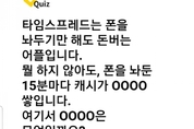 [제주교통복지신문=전희연 기자] CASHWALK(캐시워크)가 28일 오후 5시 '타임스프레드' 관련 퀴즈를 출제했다. 캐시워크는 "타임스프레드는 폰을 놔두기만 해도 돈버는 어플입니다. 뭘 하지 않아도, 폰을 놔둔 15분마다 캐시가 ○○○○ 쌓입니다. 여기서 ○○○○은 무엇일까요?"라는 퀴즈를 냈다. 타임스프레드 퀴즈 정답은 '자동으로'이다. 캐시워크 앱을 통해 참여할 수 있으며, 정답자는 랜덤으로 최대 1만캐시를 받을 수 있다. 한편, 타임스프레드는 저절로 캐시가 쌓이는 애플리케이션으로 유명세를 탔다. 제주교통복지신문, JEJUTWN